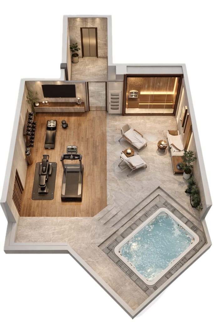 The basement includes two private rooms with a dedicated staircase, a laundry area, and a fully equipped gym. The ground floor features a spacious reception area, a modern kitchen, and a guest bathroom. The first floor offers two master bedrooms, a terrace, and an additional lounge area. The upper level is designed as a fully independent luxury suite, complete with a bedroom, kitchen, bathroom, reception area, and private terrace.